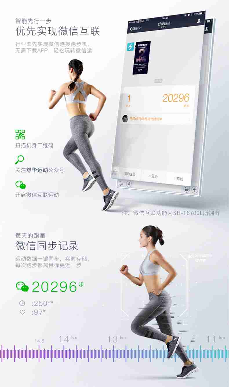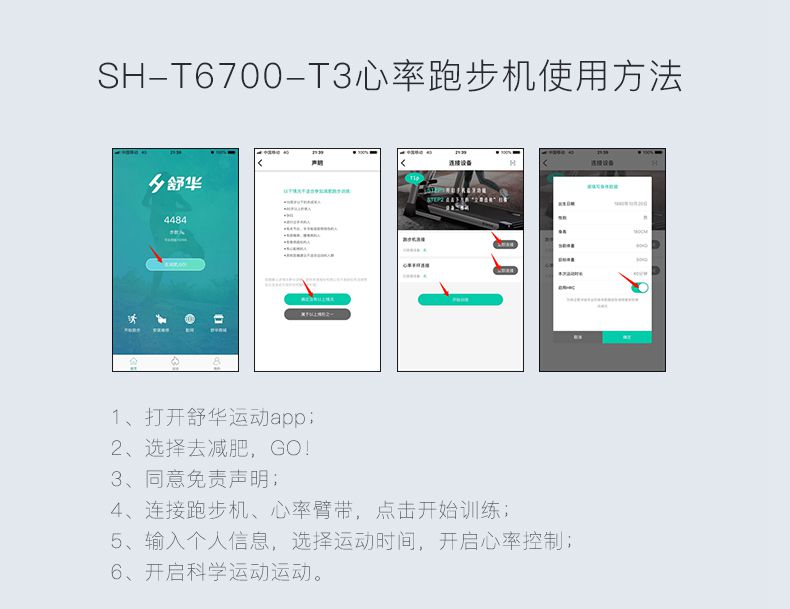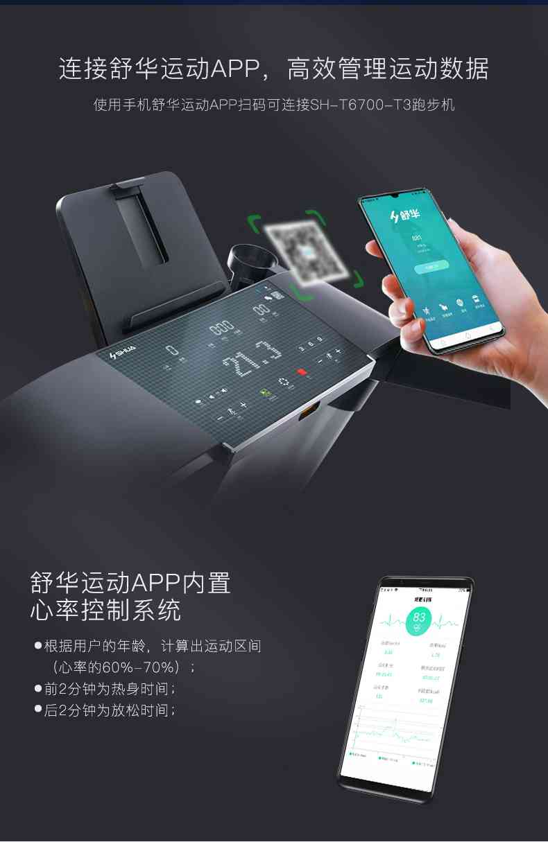 SH-T6700-T3跑步机为了帮助用户进行更加科学有效的运动,搭载谈求吧APP连接心率臂带实现心率控制,通过监测运动心率从而实现科学运动。