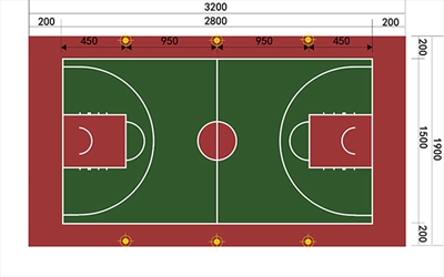 室外篮球场布灯一般采用灯杆布灯方式,常用4杆、6杆布灯方式,灯具安装高度约7-8m左右。